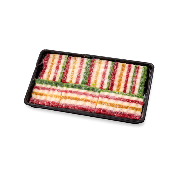 Sudedamosios dalys: cukrus, gliukozės sirupas, tirštiklis agaras, rūgštingumą reguliuojanti medžiaga citrinų rūgštis, sausi KIAUŠINIŲ baltymai, kvapiosios medžiagos: „Citrina“, „Avietė“, „Obuolys“; dažikliai: *E102, *E122, E142.